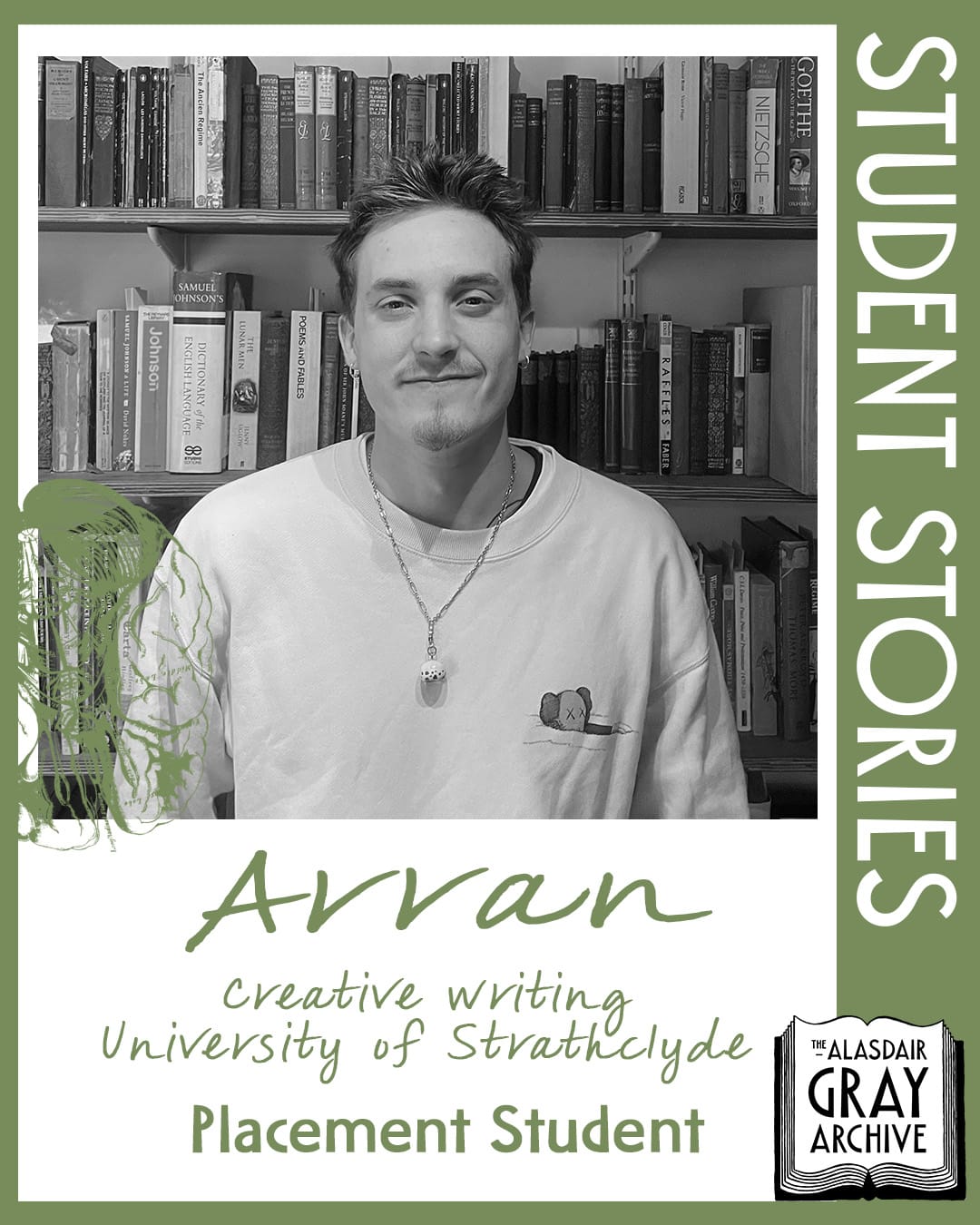 Arran undertook a placement in The Agnes Owens Archive after he wrote his undergraduate dissertation on her work and wanted to learn more about her life. He arrived with interest in Owen’s role within Scotland’s gothic literary culture and has worked draw connections between Scottish writers whose use of gothic-style literature influenced Owens’s work.