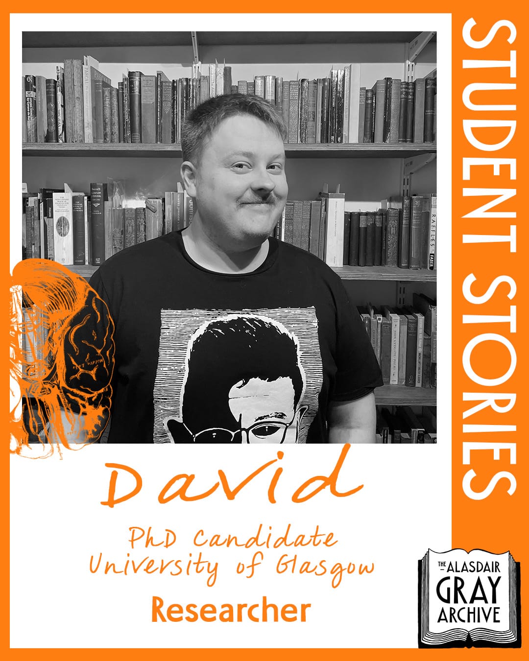 David undertook a SGSAH funded internship at AGA as part of his PhD studies at The University of Glasgow. He came to us with an existing interest in Alasdair’s work as well as an academic background in Disability Studies. During his internship, he explored his research ideas on Alasdair Gray & neurodivergence.